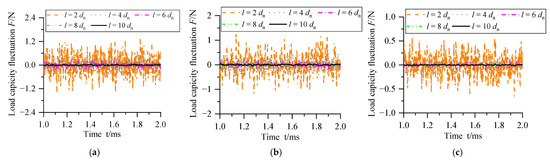 Figure 14 shows the variation curve of the load capacity of aerostatic bearings (number of micro-holes is n = 9/36/64) with time. It can be seen that with the increase in spacing of micro-holes, the amplitude of load capacity fluctuation of three types of aerostatic bearings decreases. Figure 15 shows the corresponding standard deviation. It can be seen that the standard deviation of load capacity fluctuation will decline quickly during the micro-hole spacing from 2 dn to 8 dn and remains stable during the spacing from 8 dn to 10 dn. It can be concluded that increasing the spacing of micro-holes can suppress the micro-vibration of the aerostatic bearing.