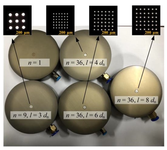 The photo of aerostatic bearings with n = 1 single-hole, n = 9 SMAR (l = 3 dn), and n = 36 SMAR (l = 4/6/8 dn) are shown in Figure 16. Details of the SMAR are captured by electron microscope. The aerostatic bearing consists of two parts, the restrictor, and the bearing pad. The bearing pad is made of aluminum alloy. The single-hole restrictor is made of a cylindrical ruby, processed by laser drilling, and then assembled into the recess of the bearing pad. The micro-hole diameter of the SMAR designed in this study can reach the micron-level, while the picosecond laser drilling technology can achieve micron-level accuracy and can ensure a more uniform micro-hole size. Therefore, the SMAR is made of cylindrical aluminum alloy by using a picosecond laser processing technology and then installed in the recess on the bearing pad.