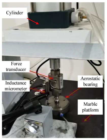 Figure 17 shows the experimental platform of load capacity testing. The experimental platform consists of a cylinder, a force transducer (PBCL, range 200–700 kg, Zhongjing, Shanghai, China), an inductance micrometer (TESA-TT20-GTL22, range ±2 mm, resolution 0.1 μm, TESA, Switzerland), two aerostatic bearings with a SMAR (n = 9, l = 3 dn, and n = 36, l = 6 dn), and a marble platform. The thickness of the air film is changed by adjusting the cylinder pressure and measured by the inductance micrometer mounted on the marble. The load capacity of the aerostatic bearing is measured by the force transducer. After multiple measurements, the average value was taken.