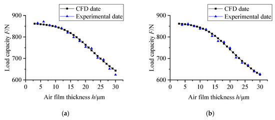 Comparison of experimental and simulation results of load capacity. (a) number of micro-holes is n = 9, l = 3 dn; (b) number of micro-holes is n = 36, l = 6 dn.