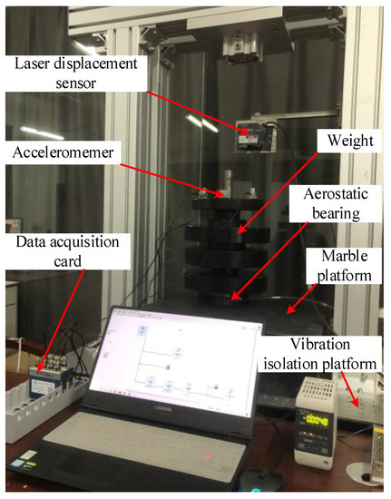 Figure 19 shows the experimental platform for micro-vibration testing. The experimental platform consists of aerostatic bearings (n = 1 single-hole, n = 9 SMAR (l = 3 dn), and n = 36 SMAR (l = 4/6/8dn)), weights, a laser displacement sensor (LK-G500, reproducibility 2 μm, KEYENCE, Japan), an accelerometer (ULT-2015, sensitivity 2500 mV/g, resolution 0.000004 g, QUATR, Beijing, China), a marble platform, a vibration isolation platform, a data acquisition card (NI-9234, 24-bit, America), and a PC (Lenovo, China) terminal. The thickness of the air film is changed by adjusting the weights and measured by the laser displacement sensor. The vibration acceleration of the aerostatic bearing is obtained by the accelerometer. The vibration signal is dealt with by a PC terminal.
