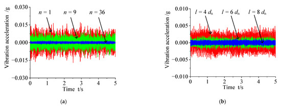 (a) Vibration accelerations in the time domain for the bearings with different numbers of micro-holes; (b) Vibration accelerations in the time domain for the bearings· (number of micro-holes is n = 36) with different spacing of micro-holes.