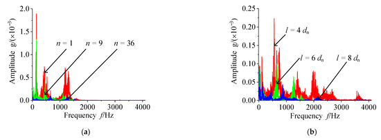 (a) Frequency characteristics of vibration accelerations for the bearings with different micro-holes; (b) Frequency characteristics of vibration accelerations for the bearings (number of micro-holes is n = 36) with different spacing of micro-holes.