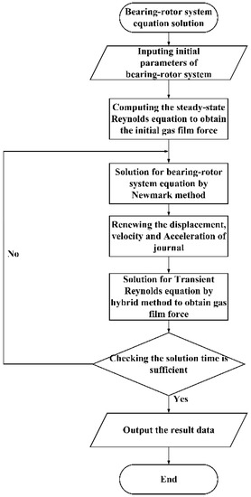 where is mass matrix, is damping matrix, is gyroscopic matrix, is the stiffness matrix, is external forces including unbalanced mass force and gas film force and is the displacement, velocity and accelerated matrix, respectively. Rayleigh damping was considered in this paper, i.e., only contains Rayleigh damping. The system is autonomous when includes only the gas film force, while the system is nonautonomous when includes unbalanced mass and gas film forces. The solution for the dynamic equations of the gas bearing-rotor system is an iterative procedure combining the Newmark method with the hybrid method, as shown in Figure 4. The iterative procedure is described as follows:
