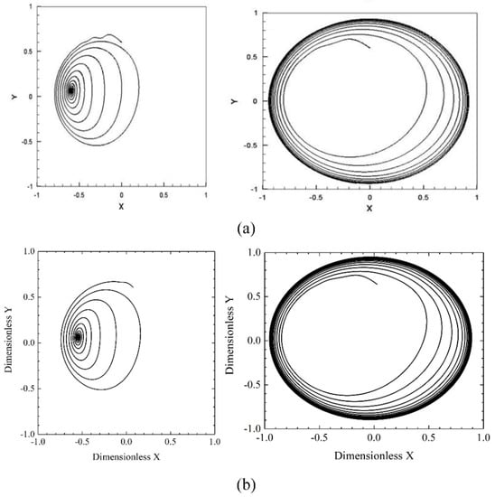 The calculation parameters are , , and or 0.15. The root locus obtained using the hybrid method is compared with the results of Ref. [15]. The hybrid method is used to solve the transient Reynolds equation and the other calculation conditions are the same as Ref. [15]. As shown in Figure 5, the root locus obtained using the hybrid method is in good agreement with the results from Ref. [15], which means that the program of the hybrid method in this paper is right. Moreover, the results show that the rotor system without unbalanced mass will approximate to a point, namely, stable focus, after transient time, shown the left of Figure 5 when the . On the other hand, with the increasing rotor mass , the behavior of the rotor system will keep a stable focus, i.e., closed cycle. From the trajectory portrait, it can be seen that there exists a limit cycle.