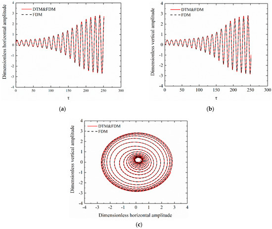 The comparison with the results from the traditional FDM. (a) time history of rotor system along X direction, (b) time history of rotor system along Y direction, (c) the orbit of the rotor center.