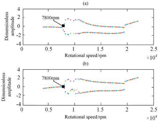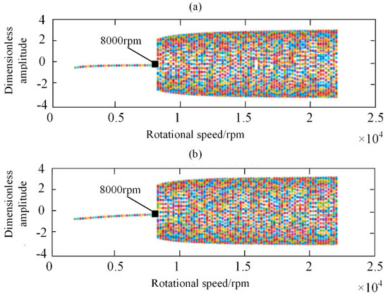 As shown in Figure 10, the bifurcation diagrams of displacement along X and Y directions are given with unbalanced mass. According to Figure 10, with increasing rotational speed, the different nonlinear behavior of the rotor system is presented at different rotational speed. When the rotational speed is less than 7800 rpm, the rotor system is in 1T-period motion. With increasing rotational speed, the 1T-period motion of gas rotor system is changed as 2T-period motion at rotational speed range of 7800 rpm to 19,400 rpm. The motion state of the system is changed as 1T-period motion under speed greater 19,600 rpm. The typical characteristics of 1T-period motion including trajectory, time history and frequency spectrum at 6000 rpm, are shown in Figure 11. As shown in Figure 11 and Figure 12, the gas rotor system is under 1T-period motion, and the orbit presents as an ellipse, while there exists only one point in the Poincaré map and the spectrum diagram contains only rotating frequency caused by the unbalanced mass force. Under the 1T-period motion, the dynamic performance of the gas bearing-rotor system is under a linear vibration state.
