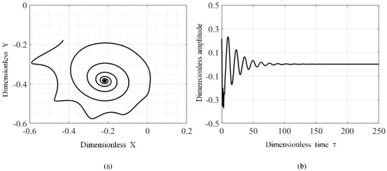 As shown in Figure 7, the bifurcation diagrams of displacement along X and Y directions are given without unbalanced mass. According to Figure 7, when the rotational speed is less than 8000 rpm, the rotor motion will approximate to a stable balance point, and the gravity is equal to the gas film force. The typical characteristics, including trajectory and time history at 6000 rpm are shown in Figure 8. As shown in Figure 8, the trajectory of the rotor system decreases with the simulation time. It approximates to a point, namely, stable focus, after transient time.
