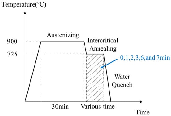 A DP microstructure consisting of martensite and ferrite was achieved by a step-quenching heat treatment as shown in Figure 1. Initially, the specimens were kept in an experimental heating oven at 900 °C for 30 min to achieve complete austenization. Later, the samples were transferred directly to the oven at a temperature of 725 °C. The transfer time was controlled within 3 s. Each specimen was kept at the critical annealing temperature of 725 °C for varying durations (0, 1, 2, 3, 6, and 7 min). In this process, austenite was progressively transformed to ferrite. The volume of ferrite generated by austenite transformation varied due to the differing annealing durations. Lastly, all specimens were water-quenched. During the water-quenching process, all the remaining austenite was transformed into martensite, whereas the ferrite developed in the critical annealing phase was not changed by water quenching. The varying holding durations of the critical annealing led to the various volume fractions of the martensite and ferrite following water quenching. As a result, DP microstructures with differing MVF required for the experiments were achieved.