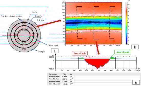 where, Shole and Speak are the areas of the “peak” and “hole”, respectively (shown as Figure 3c), V is the volume loss, d is the total sliding distance, R is the radius of the track, and N is the number of revolutions. The average wear rate of 24 cross-section calculations is taken to represent the final wear rate for a given condition.