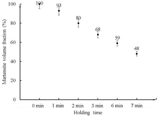 Figure 4 demonstrates the variation in the MVF of the specimen with holding duration at the critical annealing temperature. The MVF tends to decrease as the holding duration increases. Full martensitic microstructure, i.e., 100% MVF, was achieved for the specimens that were directly water-quenched. The specimen with the longest holding duration at 725 °C had an MVF of 48%, which was also the minimum MVF among all experimental samples.