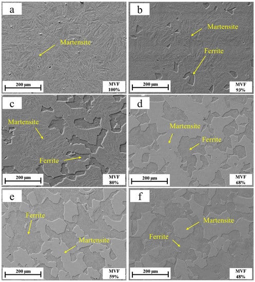 Figure 5 shows SEM photomicrographs of specimens with different MVFs. As the MVF decreases, the progressively growing ferrite divides the bulk martensite into islands.