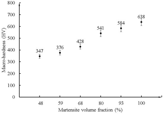 In general, the hardness of the martensitic phase is greater than that of the ferrite phase, which has also been confirmed in many in previous studies [21,24,32,33]. Higher martensite content implies higher macrohardness. Figure 6 illustrates the variation in the macrohardness with MVF of the specimens after heat treatment. The macrohardness gradually increases with increasing MVF. The maximum macrohardness value occurs for the specimen with 100% MVF and 638 HV, and the minimum macrohardness value appears for the specimen with 48% MVF and 347 HV. Thus, it can be concluded that the variation in MVF has a significant impact on the macrohardness of DP steel.