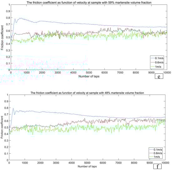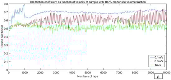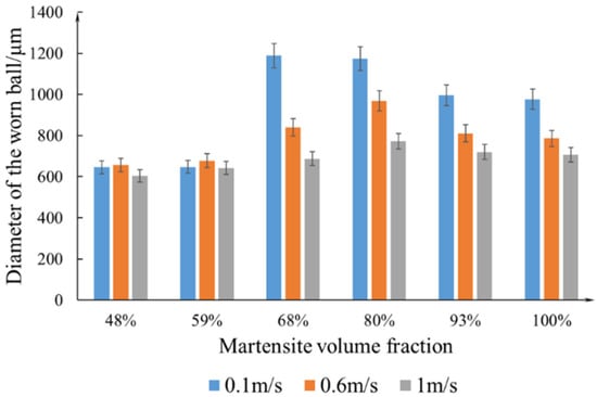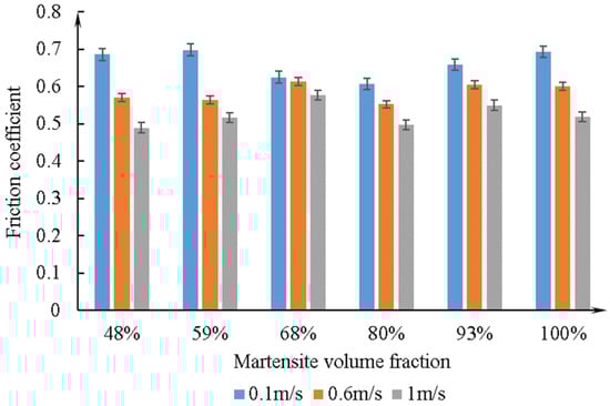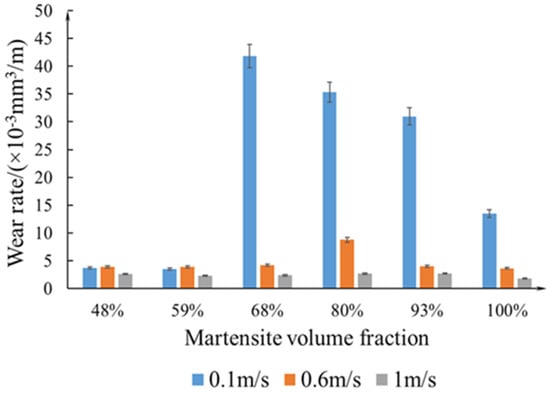 Traditionally, sliding velocity (SV) is considered one of the most significant parameters in tribological systems [1,2,3,4]. In engineering applications, most mechanical components are fabricated by heat-treated steels and typically serve in dry conditions with SV below 1 m/s [5,6,7]. Numerous studies [2,3,8,9,10,11] have been devoted to the impact of SV on the tribological performance of steel.