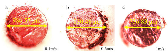 Variation of worn diameter of Al2O3 balls with SV at MVF 93%: (a) 0.1 m/s, (b) 0.6 m/s, (c) 1 m/s.