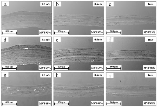 SEM images of worn tracks under different MVF and sliding velocities: (a) MVF93% and 0.1 m/s, (b) MVF93% and 0.6 m/s, (c) MVF93% and 1 m/s, (d) MVF68% and 0.1 m/s, (e) MVF68% and 0.6 m/s, (f) MVF68% and 1 m/s, (g) MVF48% and 0.1 m/s, (h) MVF48% and 0.6 m/s, (i) MVF48% and 1 m/s.