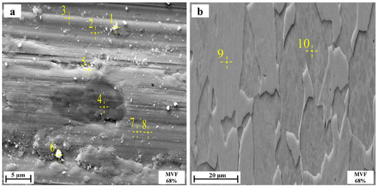 EDS analysis on the points: (a) worn track (points 1–8) at 1 m/s and MVF 68%, (b) unworn surface (points 9,10).
