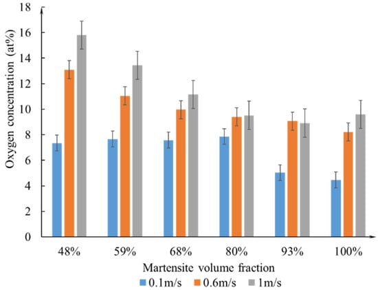 Figure 14 presents the evolution of the average oxygen content in the wear surface of the specimen under different SVs. The SV has a major impact on element transfer during the experiment. The oxygen concentration on the worn surface increases with SV. This means that the frictional oxide increases as the SV increases. For the same SV, the generation of oxides in the worn tracks is reduced for specimens with high MVF compared to those with low MVF.