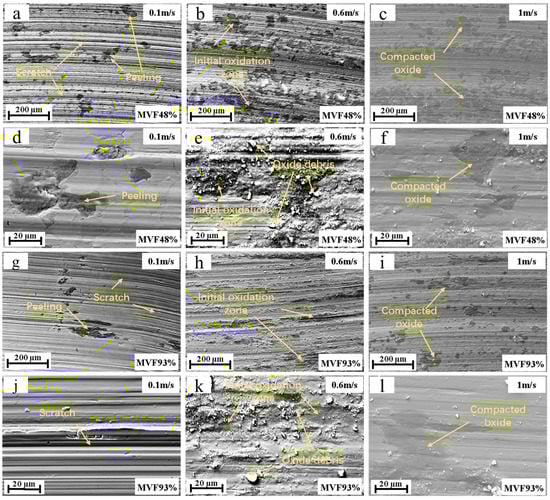 Micrographs and local enlargements of the worn tracks formed with varying MVF and SV: (a–c) are the worn tracks at MVF48% and different speeds; (d–f) are the enlarged views of (a–c); (g–i) are the worn tracks at MVF93% and different speeds; (j–l) are the enlarged views of (g–i).
