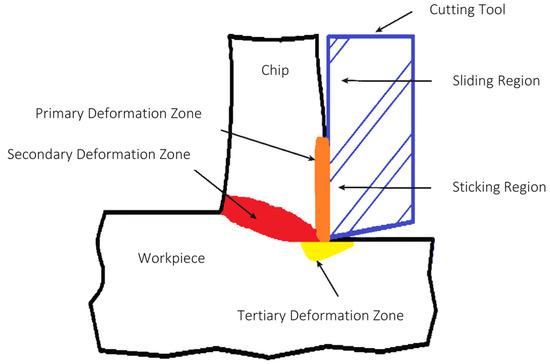 In orthogonal machining problems, a hard and solid cutting tool passes through a relatively softer workpiece, and the process simulation is carried out using non-linear governing equations [6]. The cutting process is categorized into three deformation zones, as shown in Figure 1 [7]. The primary deformity zone and secondary deformity zone near the cutter edge constitute the principal deformity zones. The workpiece undergoes high deformation with an enormous strain rate in this region. The third deformation zone lies on the clearance face. Deformation happens in this zone when the newly machined surface is rubbed by the clearance face of the tool [8].