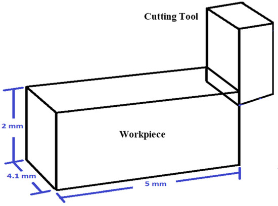 The workpiece and tool geometry is presented in Figure 2. The workpiece dimensions are set as 5 mm × 2 mm, along with a thickness of 4.1 mm [35,38]. The cutting tool inserts CCMW 09 T3 04-H13A (ISO specification), and has a nose radius of 0.04 mm, and a rake angle and a clearance angle of 0° and 7°, respectively [38,39]. In the current model, the cutting tool is assumed as rigid.