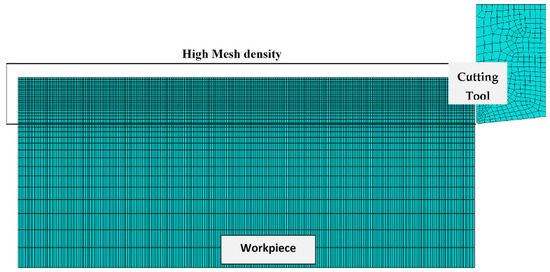 The element type has been set as 3D stress with an explicit time integration scheme in the present case. This resulted in eight-node liner brick elements with ‘reduced integration’ and ‘hourglass control’. The use of distortion control can prevent extreme deformations as it prevents the negative element volumes. However, as per the literature, enhanced hourglass mode has been utilized to prevent the hourglass effect, as the enhanced hourglass control works better for first-order solid elements with reduced integration [49,50]. The total number of elements varies for different feed rates. The total number of elements for the workpiece was 369,237, with an element size of 0.02 mm in the cutting region. The workpiece meshing is shown in Figure 3. The sizing controls have been used along the vertical edges of the workpiece to keep the element count low without affecting the accuracy of the results. The total number of elements for the tool consists of 4108 elements and 4956 nodes.