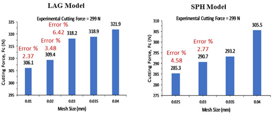 Mesh convergence is performed for both the LAG and SPH models, as shown in Figure 5. The experimental cutting force obtained at cutting velocity = 250 m/min and at f = 0.1 mm/rev is selected as a criterion for the mesh convergence study. The mesh size is 0.02 mm × 0.02 mm for the LAG model based on the mesh convergence study, as seen in Figure 5. The error percentage for this mesh size is 3.48%, while the error percentages for 0.01 mm and 0.03 mm mesh sizes are 2.37% and 6.42%, respectively. The SPH model’s mesh size is 0.03 mm × 0.03 mm based on the mesh convergence study, as seen in Figure 5. The error percentages for 0.025 mm and 0.03 mm mesh sizes are 4.58% and 2.77%, respectively.