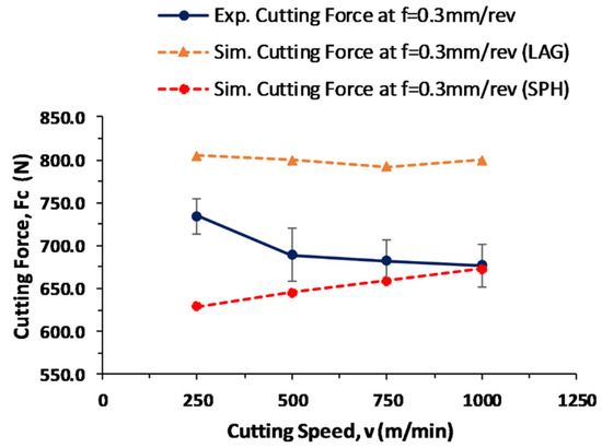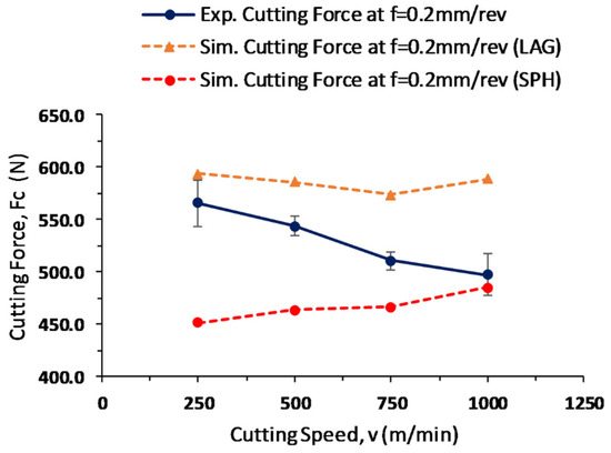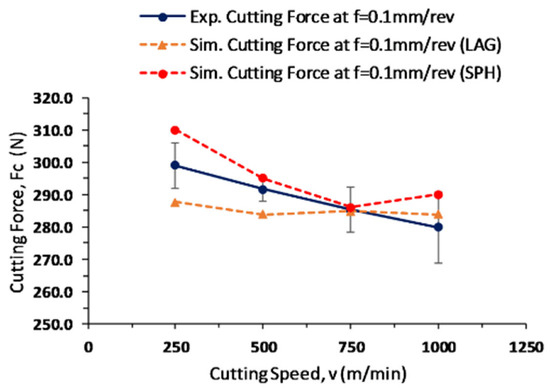 The cutting force values of the experimental work are compared with the simulated cutting forces acquired from the LAG and SPH models, as shown in Figure 7, Figure 8 and Figure 9. The simulated cutting force values are noted when the chip formation reaches a steady state and when the cutting force values deviate less from the mean value. An average value is considered from both models to collect the overall behavior of the cutting forces. The LAG model usually overestimates the cutting force values, which is evident from the current research, and the SPH model underestimates the cutting force values.