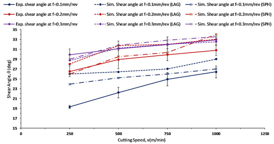 The behavior of the shear angle while machining is opposite to that of chip thickness, in that the shear angle values rise with the increase in the cutting speed and the feed rate [25]. The increasing behavior of the shear angle has been predicted well by both LAG and SPH models, as seen in Figure 10.