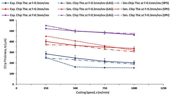 Moreover, the chip thickness values keep reducing with increased cutting speed [25], as shown by the experimental results in Figure 11. This reducing behavior is predicted correctly by both the LAG and SPH models. The chip thickness comparison at cutting speeds of 250 m/min and 1000 m/min, with feed rates of 0.1 mm/rev and 0.4 mm/rev, respectively, is shown in Figure 12.