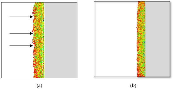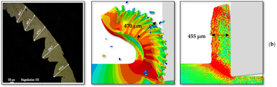 Johnson–Cook’s damage law has been used for both the LAG and SPH models. The damage in the case of the LAG model has been applied only to the sacrificial layer, and the remaining part of the workpiece has been given no damage. The resulting chip is shown in Figure 15a. The results obtained for all primary variables are appropriate for using this technique. The damage law can be applied to the whole workpiece, but that resulted in discontinuous chips [65], which was not the requirement for the current research work, as shown in Figure 15b.