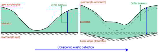 The dependence of the oil film thickness on pressure (including hydrodynamic pressure and asperity contact pressure) cannot be neglected when the two mating bodies are elastic. As shown in Figure 1, the oil film thickness is given by the sum of and . The variable is the oil film thickness in the case of rigid bodies. The deflection of the solid surfaces is expressed as . The variable is the deflection of the solid surface due to the hydrodynamic pressure, is the deflection of the solid surface due to the asperity contact pressure: