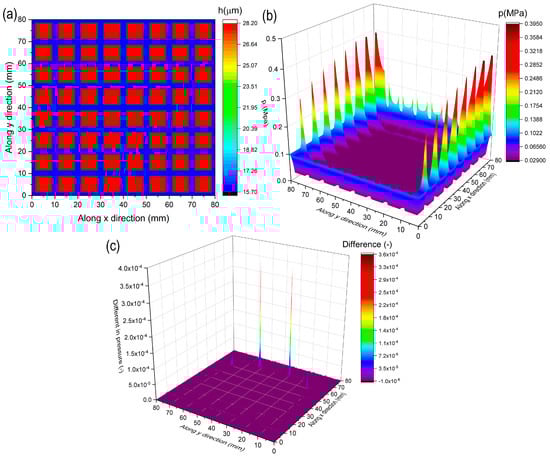 The distributions of oil film thickness (a), hydrodynamic pressure (b), and the difference in the results of the current method and reference [] (c).