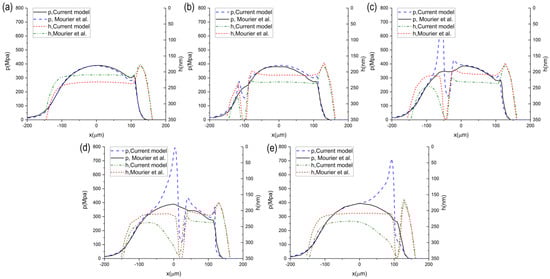 The distribution of the oil film thickness and hydrodynamic pressure along the center liner of the ball/disc conjunction with moving texture, with the results of Mourier et al. [] as the references: (a) ; (b) ; (c) ; (d) ; (e) . Adapted from Ref. [], 2006, with permission from Elsevier.