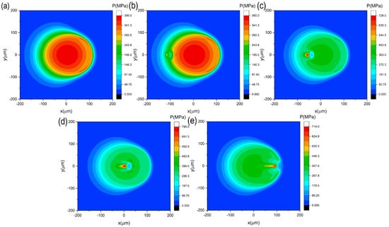 The distribution of the hydrodynamic pressure for the ball/disc conjunction with moving texture: (a) ; (b) ; (c) ; (d) ; (e) .