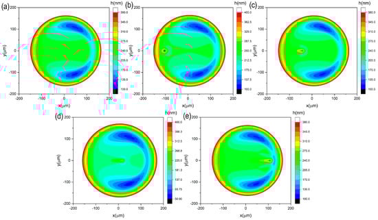 The distribution of the oil film thickness for the ball/disc conjunction with moving texture: (a) ; (b) ; (c) ; (d) ; (e) .