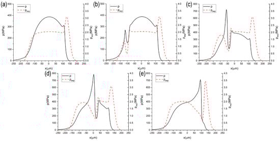 The distribution of the hydrodynamic pressure and asperity contact pressure along the center liner of the ball/disc conjunction with moving texture for : (a) ; (b) ; (c) ; (d) ; (e) .