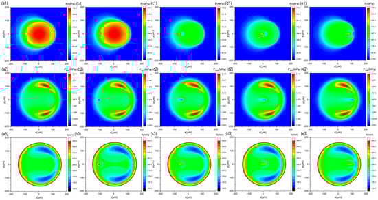 The distribution of the hydrodynamic pressure (a1, b1, c1, d1, e1), asperity contact pressure (a2, b2, c2, d2, e2), and oil film thickness (a3, b3, c3, d3, e3) for the ball/disc conjunction with moving texture: (a1–a3) ; (b1–b3) ; (c1–c3) ; (d1–d3) ; (e1–e3) .