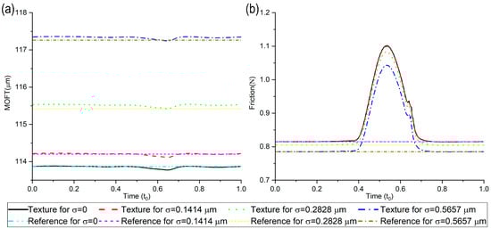 Moreover, Figure 9 shows the variation of MOFT and friction with time for different roughness values along the passage of one individual texture under the ball. It is worthy to note that friction was evaluated based on the following expression:
