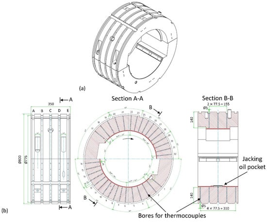 In summary, 124 type K thermocouples are applied in five layers to the test bearing. The left part of Figure 2b shows the layers denoted as A to E. The layers A and E are outside the top pad, and therefore, feature thermocouples only in the highly loaded pad. The middle part of Figure 2b exhibits the thermocouple locations in layers B and D that are same as in C, with the exception of the missing thermocouples at the pocket positions. All thermocouples applied outside of the pocket region feature a radial distance of 10 mm to the sliding surface of the 5 mm Babbitt layer.