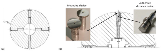The hollow test shaft features an inner diameter of 150 mm. It is equipped with two capacitive distance sensors and two piezo-electric pressure sensors embedded in the shaft surface. The sensors are arranged in the mid plane of the shaft; they are shifted by 90° towards each other with the same type of sensors being 180° apart in the four bores in Figure 4a. The sensors are integrated to a mounting device that is fixed in these bores, as shown in Figure 4b. Finally, the surface of the mounting device is ground to smooth to the circular sliding surface profile of the shaft without steps at the interfaces. Wires transmit the sensor signals through the central bore, depicted in Figure 4a, to a slip-ring transmitter at the front end of the journal that connects the rotating system to the stator side. The redundant sensor system enables an accurate measurement of film thickness and film pressure. However, the capacitive proximity probes require knowledge of the dielectric constant of the intermedium. Therefore, the film thickness can only be measured reliably in areas where the gap is completely filled with oil. This is because the dielectricity of the gas phase significantly differs from the one of the oil and the local mass or volume ratio between oil and gas is unknown. By means of a shifting device, the rotating shaft, and thus, the sensor plane can be shifted axially over the entire bearing width during measurement. Both the fluid film thickness and pressure distribution are identified in a high-resolution two-dimensional (2D) data field with up to 4000 data values detected in the axial direction, depending on the rotor speed. A rotary decoder provides 240 data values in the circumferential direction independently of rotating frequency.