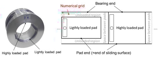 The extended and generalized Reynolds Equation (1) is valid to describe fluid flow in the entire sliding surface region of conventional fixed-pad bearings, with the exception of the lube oil pockets. These lube oil pockets exhibit a more complex flow that is generally simplified to a boundary condition in the solution of the Reynolds equation. In contrast to conventional bearing designs, the investigated offset-halves bearing cannot be described by a simple rectangular solution domain of the Reynolds equation. Figure 5 shows the test bearing, including its transformation to a two-dimensional plane. The numerical grid marked in red covers the entire bearing domain. Based on the assumptions in its derivation from Navier–Stokes equations, the Reynolds equation is valid on the two separated pads. Generally, fluid flow outside the pad region is complex, three-dimensional and two-phase. To model this flow in a numerically efficient manner in a T(E)HL-bearing code, the following assumptions are made to simplify numerical complexity: