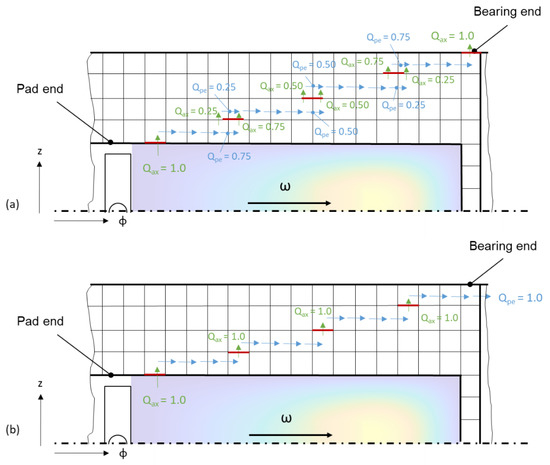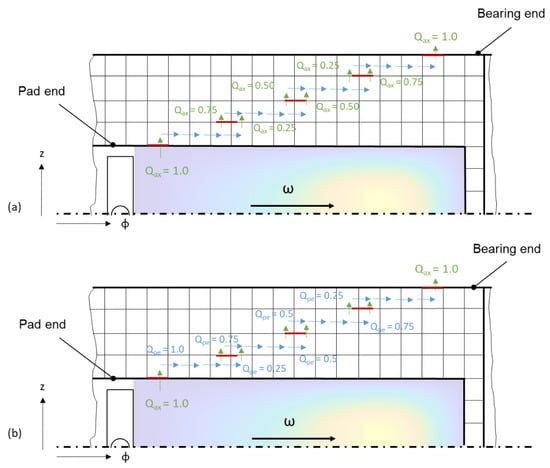 This additional fluid flow can be distributed to the numerical grid defining sinks and sources in the solution domain of Equation (5), at the finite volume cells that are located at the interfaces where the streamline crosses the axial gridline. Figure 6 explains the basic idea of the algorithm and the distribution of oil flow to the numerical grid outside the lubricant gap by a simple example for a streamline with a nondimensional flow rate of Qax = 1.0 with n = 3.25, according to Equation (7). Green arrows signal axial flow rates and blue arrows represent peripheral ones. The interfaces marked in red where the flow crosses the axial boundaries of the cells shift by n cells in the direction of rotation from one to another lane in the axial direction. The green numbers in Figure 6a show the distribution of the axial flow rate to the respective cells. Figure 6b contains the same information for the peripheral flow rates. All unlabeled blue arrows represent peripheral flow rates of Qpe = 1.0. In the example, the lubricant side flow of the cell crosses the bearing end and becomes the direct side flow of the bearing. In the case of n = 3.75, the interface marked in red would be shifted by two additional cells, as shown in Figure 7a. A value of n > 3.75 leads at least to a partial carry-over of the pad side flow of this particular cell to the downstream pad. Starting with n = 4.0 in Figure 7b, a complete carry-over of lubricant side flow occurs for this particular case. Equation (8) provides the general criterion for a complete carry-over.