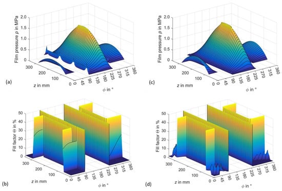 (a,c) Pressure and (b,d) fill factor distribution without (a,b) and with (c,d) the extended model (n = 3000 rpm, pq = 0.5 MPa).