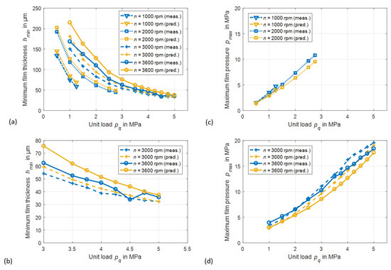 Measured and predicted (a,b) minimum film thickness and (c,d) maximum film pressure.