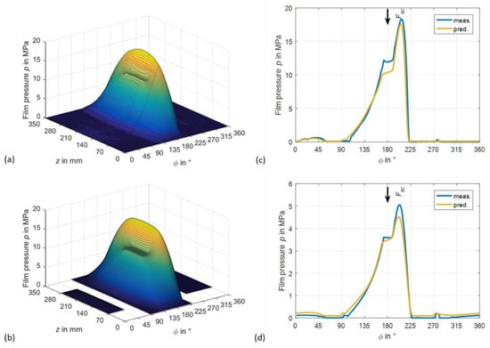 (a) Measured and (b) predicted pressure distribution and (c) comparison of the results in the axial middle plane (n = 3600 rpm, pq = 5.0 MPa), and (d) comparison for reduced load (n = 2000 rpm, pq = 1.5 MPa).