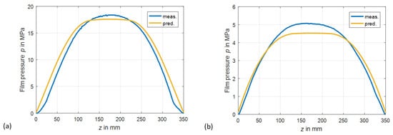 Measured and predicted pressure distribution in axial direction at maximum film pressure position ((a), n = 3600 rpm, pq = 5.0 MPa; (b) n = 2000 rpm, pq = 1.5 MPa).