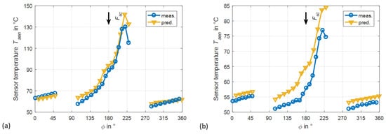 The higher values of predicted maximum temperature compared to the corresponding experimental data in Figure 10 are again visible in the local temperatures in the axial center plane in Figure 14. While the overall characteristics of measured and predicted temperatures at the sensor positions match well, the following two major differences are present. First, the highest deviations of experiment and simulation exist for the two sensors at the trailing edge (TE) of the highly loaded pad, where ΔTsen,TE = 17 K are observed for the high load case (a) and ΔTsen,TE = 10 K are present for the lower case (b). Second, the predicted leading edge (LE) temperatures of both pads are higher than the experimental ones. For case (a), a difference of ΔTsen,LE = 6 K exists at the leading edge of the highly loaded pad. This value reduces to ΔTsen,LE = 3 K in case (b). The oil inlet model assumes a complete carry-over of hot oil from the trailing edge of the upstream pad to the leading edge of the downstream pad, where it enters the sliding surface as a mixture with the fresh oil supplied in the lube oil pocket. However, the investigated bearing features large space between the pads regions that might influence the carry-over procedure. Moreover, the specific geometric properties and complexity of the bearing modify heat flow in the shell, and these influences are partly not included in the heat conduction equation of the TEHL model.