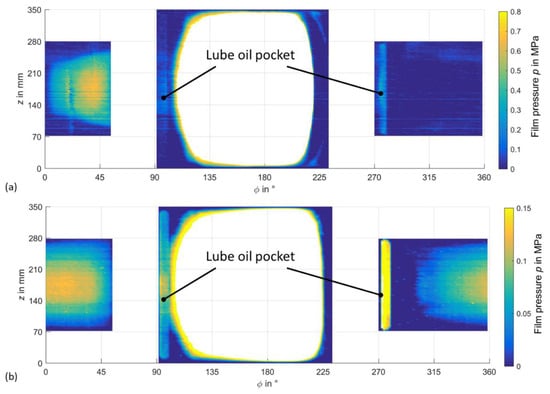 Aside from the identification of film pressure and thickness, the data measured by the piezoelectric pressure and the capacitive proximity probes can be evaluated to identify possible cavitation regions. For this purpose, the comparison to predicted results is also used. Starting behind the lube oil pocket at the leading edge, the film pressure remains nearly equal to the ambient one on the upper pad for the high load case in Figure 15a, and it starts to increase at approximately ϕ = 0°. However, ambient pressure acts at the pad’s lateral end regions and not only on its axial edges. Additionally, isobaric lines in the pad region do not show the classical elliptical shape that is well known for hydrodynamic pressure distributions. In this concrete case, lines of equal film pressure tend to exhibit a trapezoidal shape. For the medium load case in Figure 15b, only a short angular span of nearly ambient pressure exists behind the lube oil pocket of the lightly loaded pad. The high-pressure region of the lower, highly loaded pad is not depicted with its concrete value levels in Figure 15, but the transition to the ambient pressure region can clearly be observed. Potential cavitation regions exist behind the lube oil pocket at the leading edge, and at the trailing edge of the pad with a higher share in terms of area in the case of the high-speed load case.