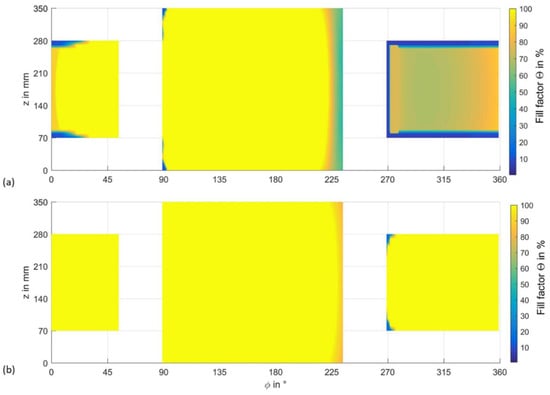 As already described for Figure 13a, Figure 16a shows high film thickness gradients in the axial direction and values above the chosen limit of 1200 µm at the leading edge region behind the lube oil pocket. In contrast to the medium load case in Figure 16b, these gradients remain present nearly until the trailing edge of the pad at ϕ = 45°. Low thermal and mechanical loads on the upper pad avoid attributing this phenomenon to deformations but point to cavitation as the cause of this behavior. On the highly loaded pad, both load cases show a significant increase in film thickness directly behind the lube oil pocket at the lateral bearing ends. This behavior can be attributed to a gas phase in this region, as deformation in this magnitude can be excluded here. At the trailing edge, film thickness values increase significantly too. This is more clearly observable in Figure 13c,d by a comparison to predicted film thickness values that exhibit much lower values for the lubricant gap. The predicted fill factors in Figure 17 support the analysis of measured pressure and film thickness distribution and its evidence on cavitation; however, the potential cavitation regions identified shortly behind the lube oil pockets near the axial bearing ends are not predicted by Elrod’s algorithm. The measurement data provide indications of cavitation areas with a larger local extent. However, they do not give a clear insight into the particular formation and morphology of cavitation in these areas. Streamlets with gas cavities, as measured by Heshmat [25] for journal bearings or Bulut et al. [26] in seals, cannot be proven.